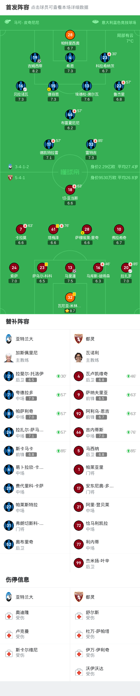 下半场的比赛依然激烈,雷特吉在第74分钟制造点球机会,亲自站上点球点主罚,但被都灵门将瓦尼亚-米林科维奇-萨维奇神勇扑出,让亚特兰大再次错失得分良机。尽管双方都有机会取得领先,但最终比赛以1-1的平局告终,让球迷和教练组都有些遗憾。